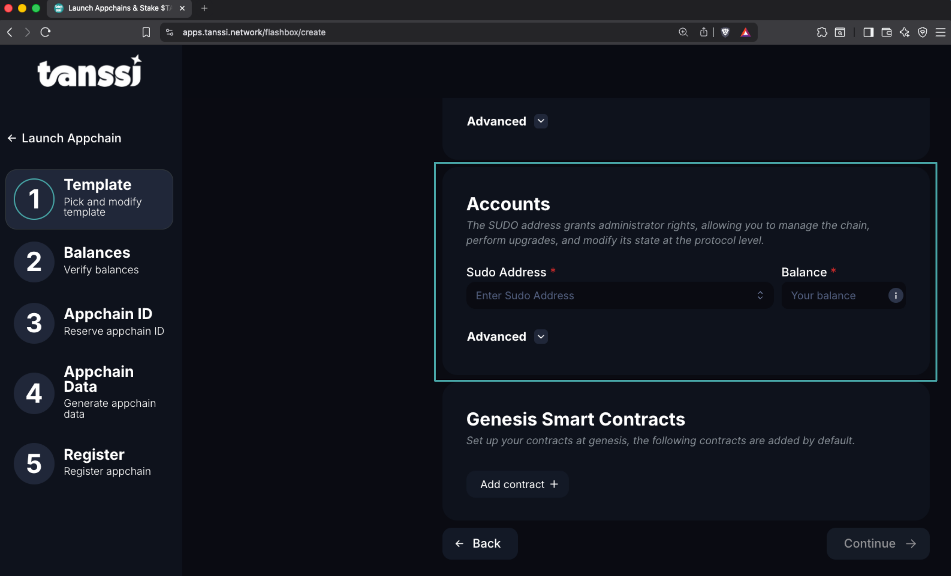 In the first step to deploy a new Tanssi-powered appchain, you must define the account that will have sudo privileges in the Accounts section.