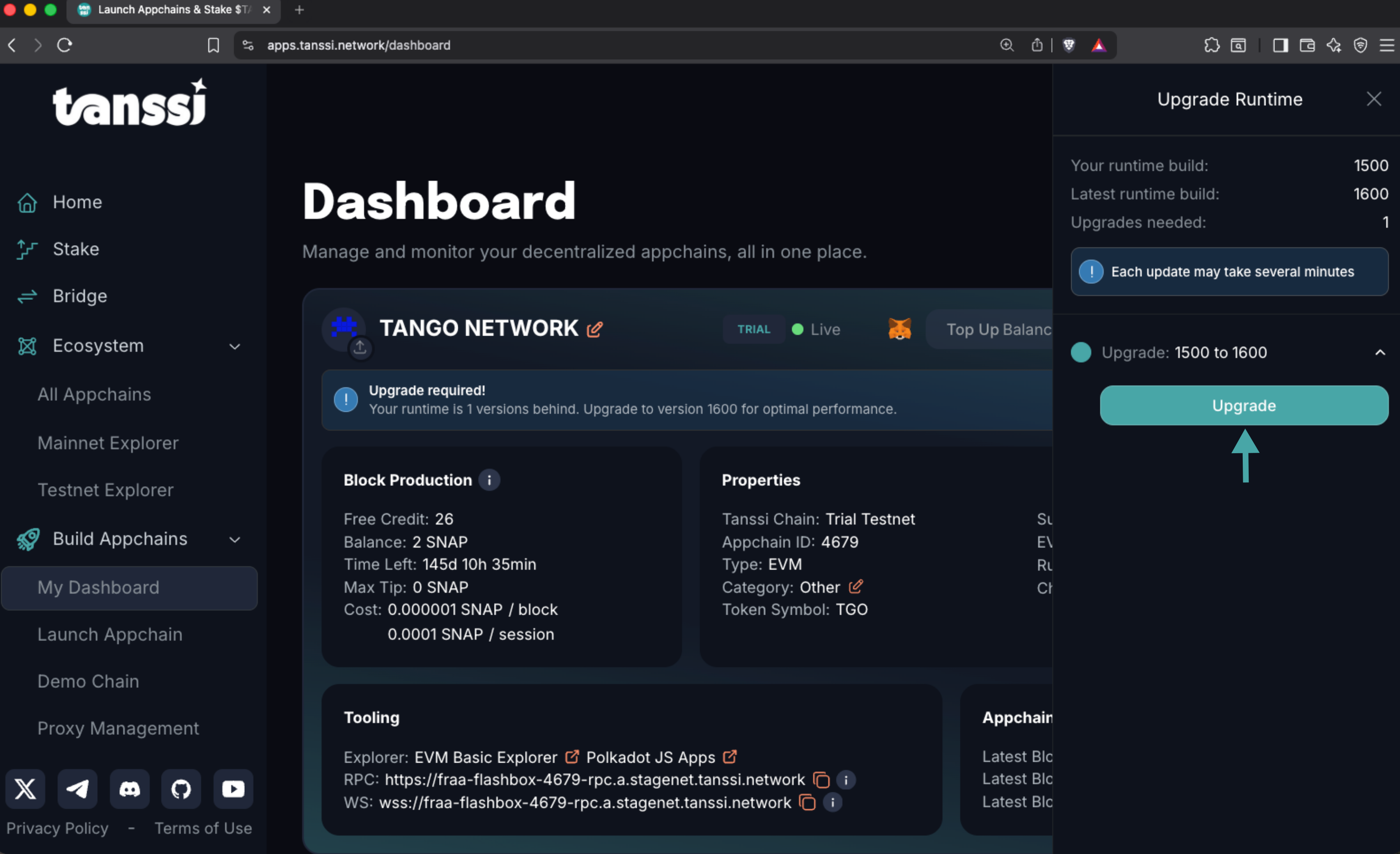 In this example, the appchain's runtime is outdated, and an upgrade is available. We start the runtime upgrade by clicking on the Upgrade button and signing the transaction.