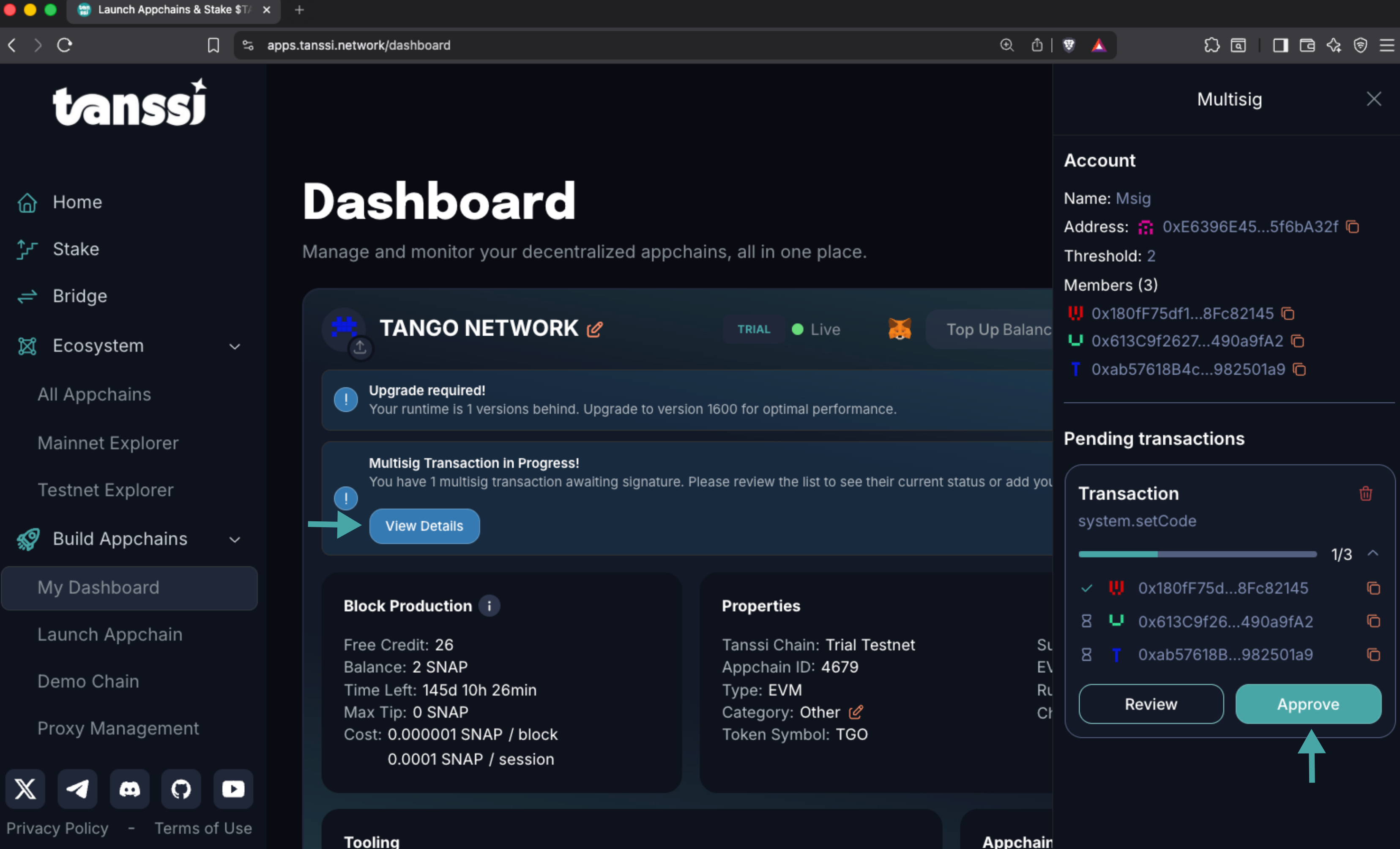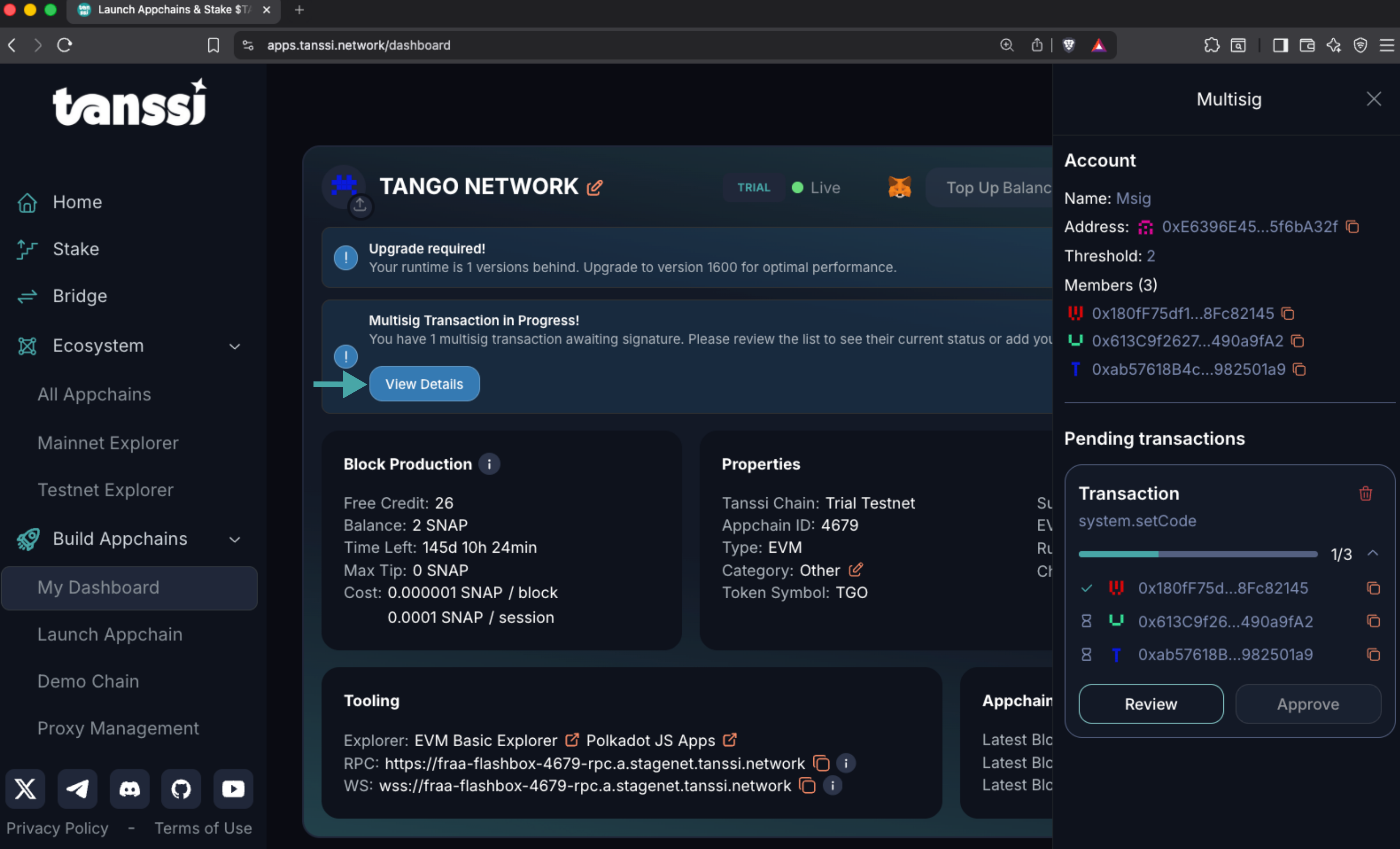 To create a privileged transaction, head to the Tanssi dApp and connect one of the multisig addresses.