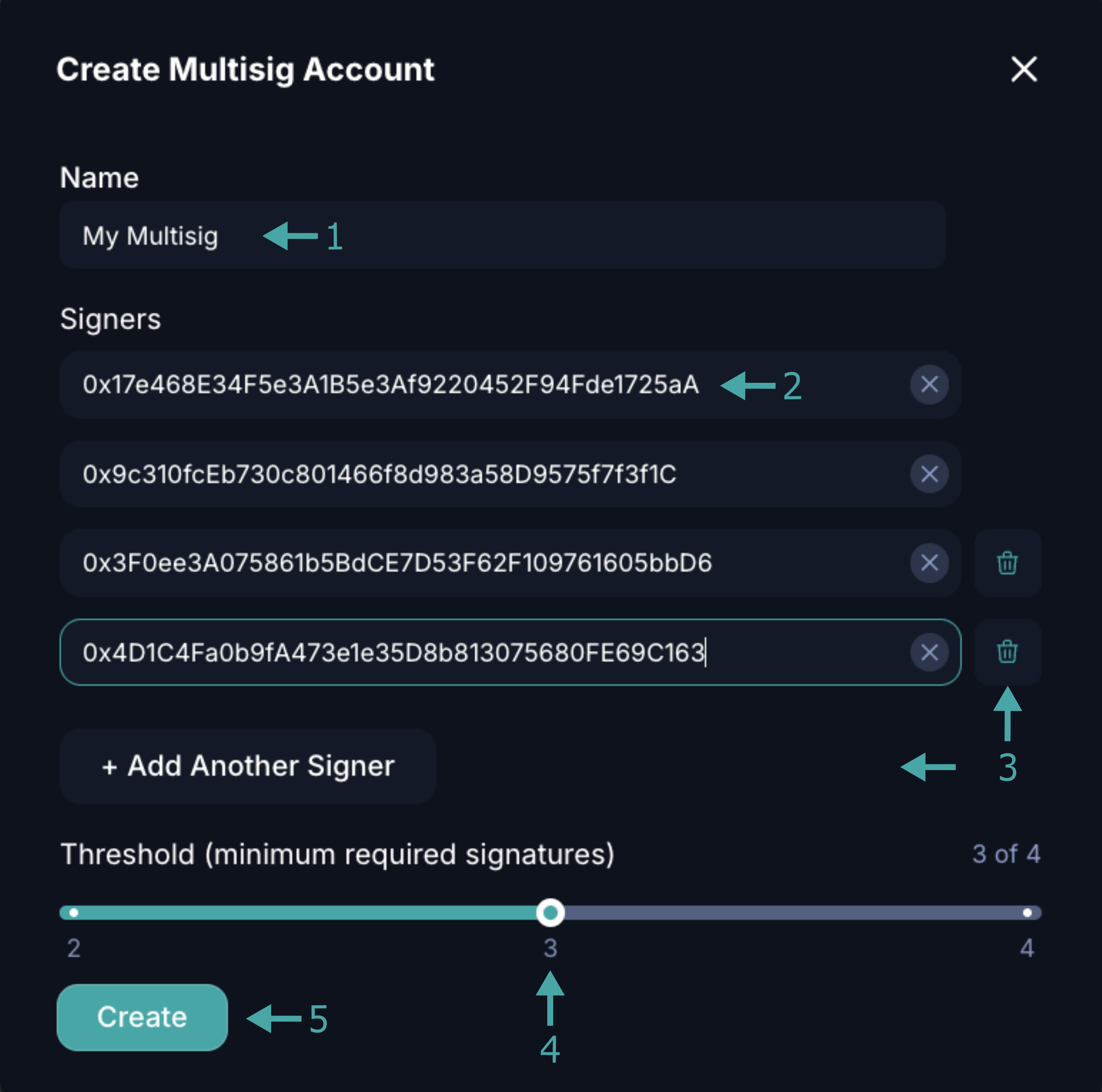 To create a new multisig, click Create Multisig Account and follow the steps in the modal windows that appear: