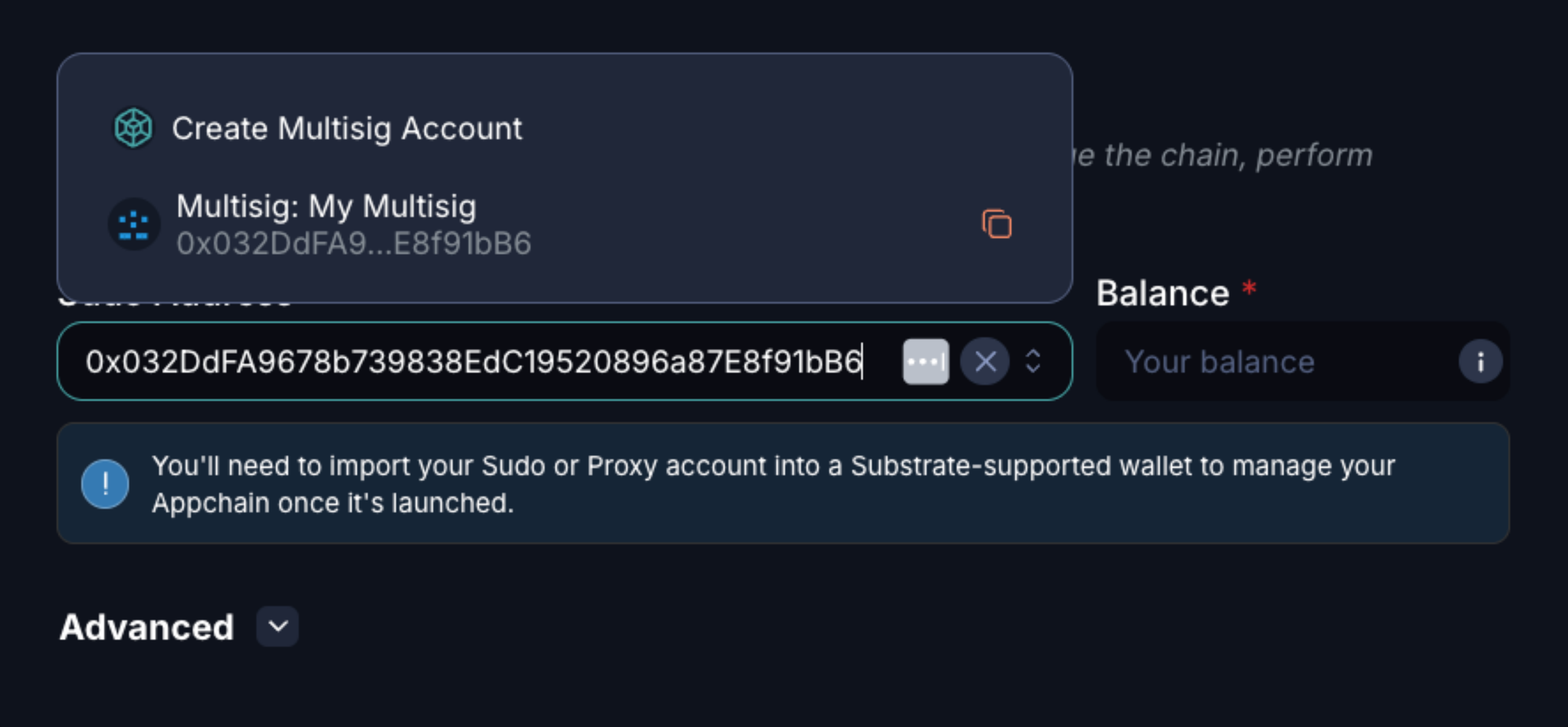 - Your appchain's Sudo account, imported into any of the supported wallets