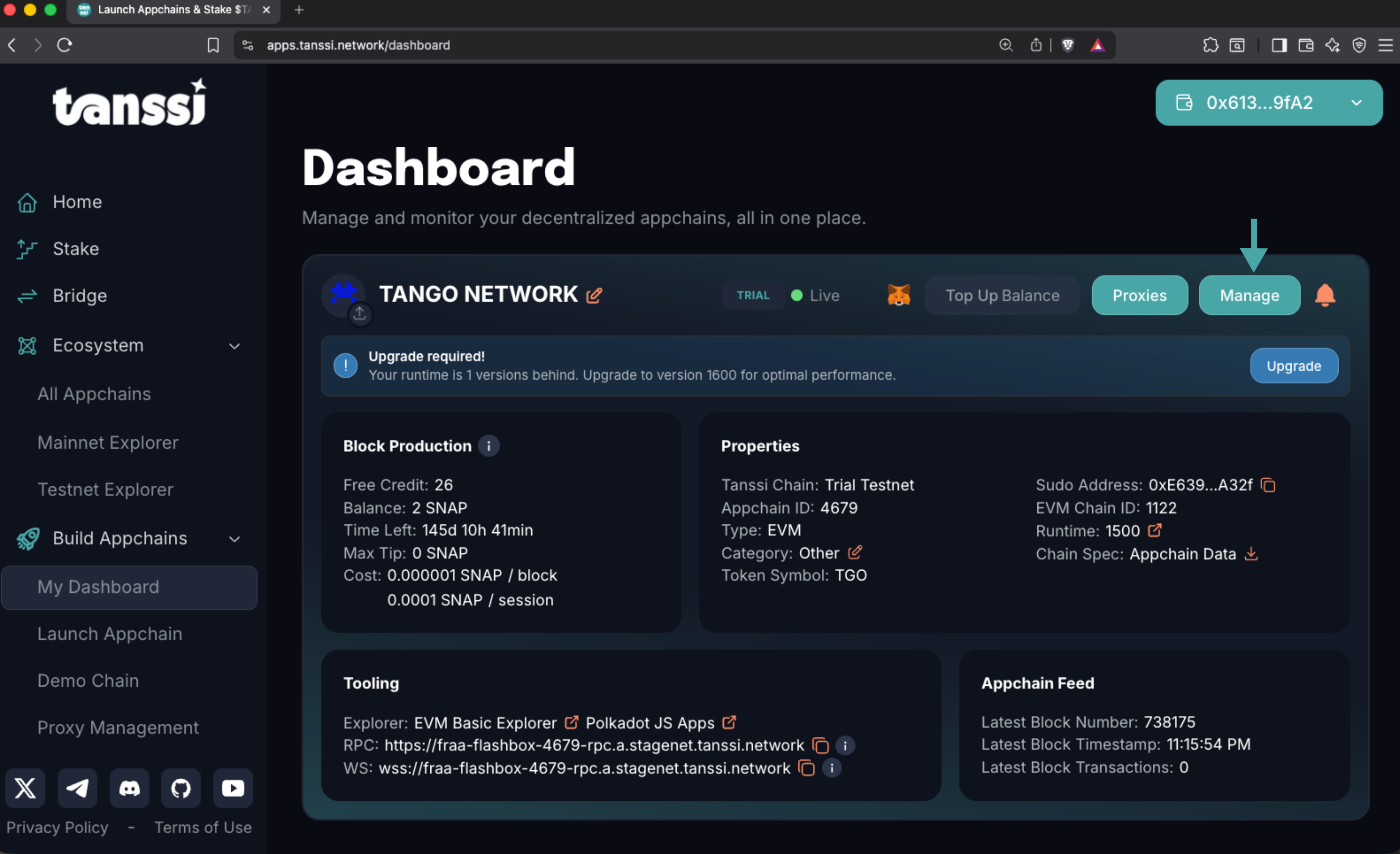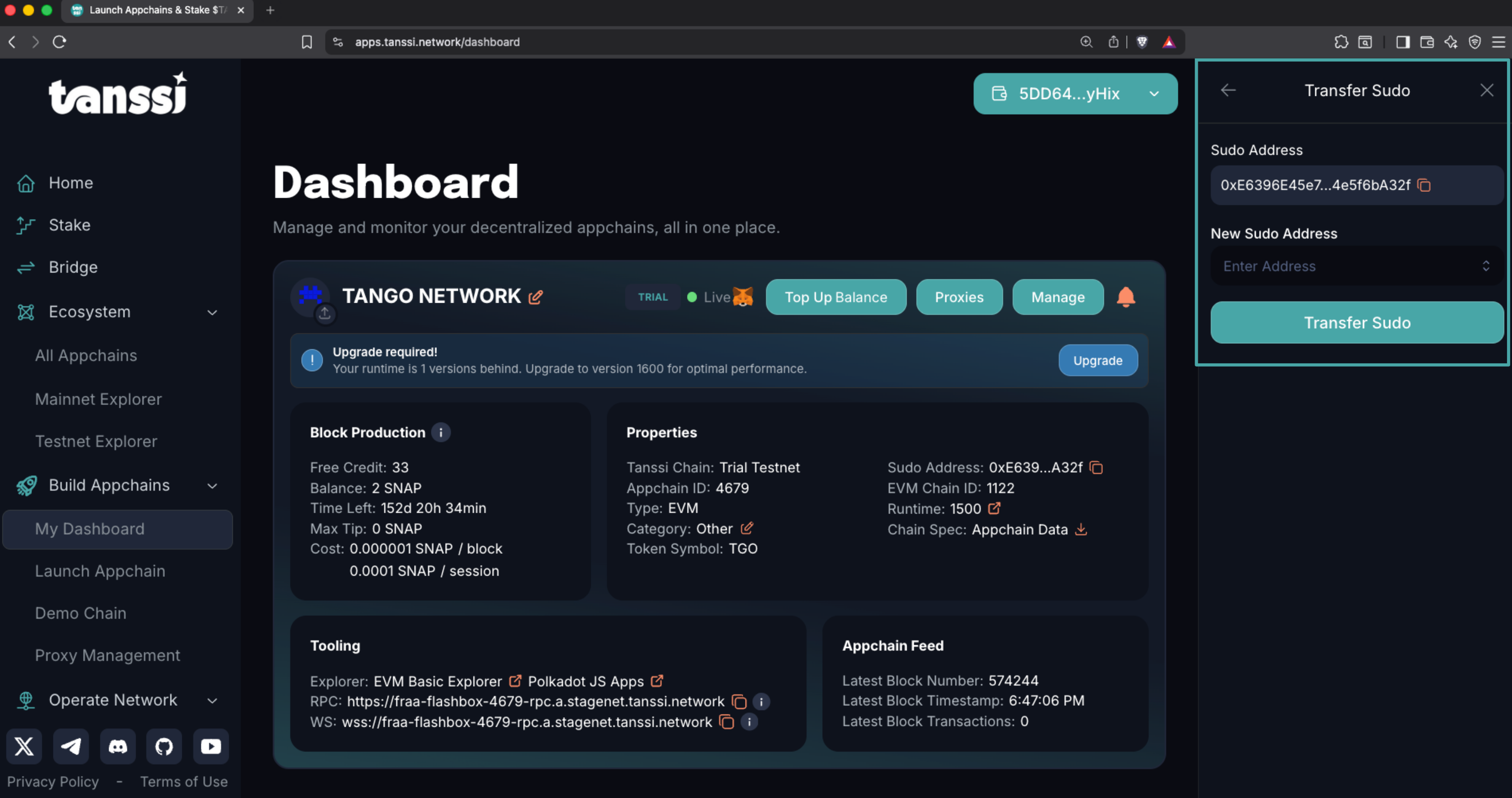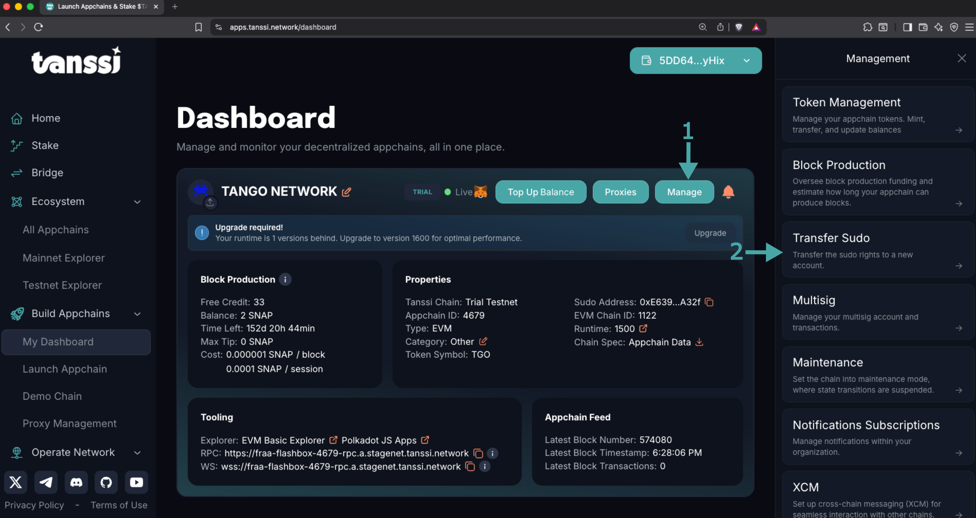 If you already have a live Tanssi-powered appchain, you can easily transfer the sudo rights to a multisig setup. To do so, head to the dashboard and on your appchain's card: