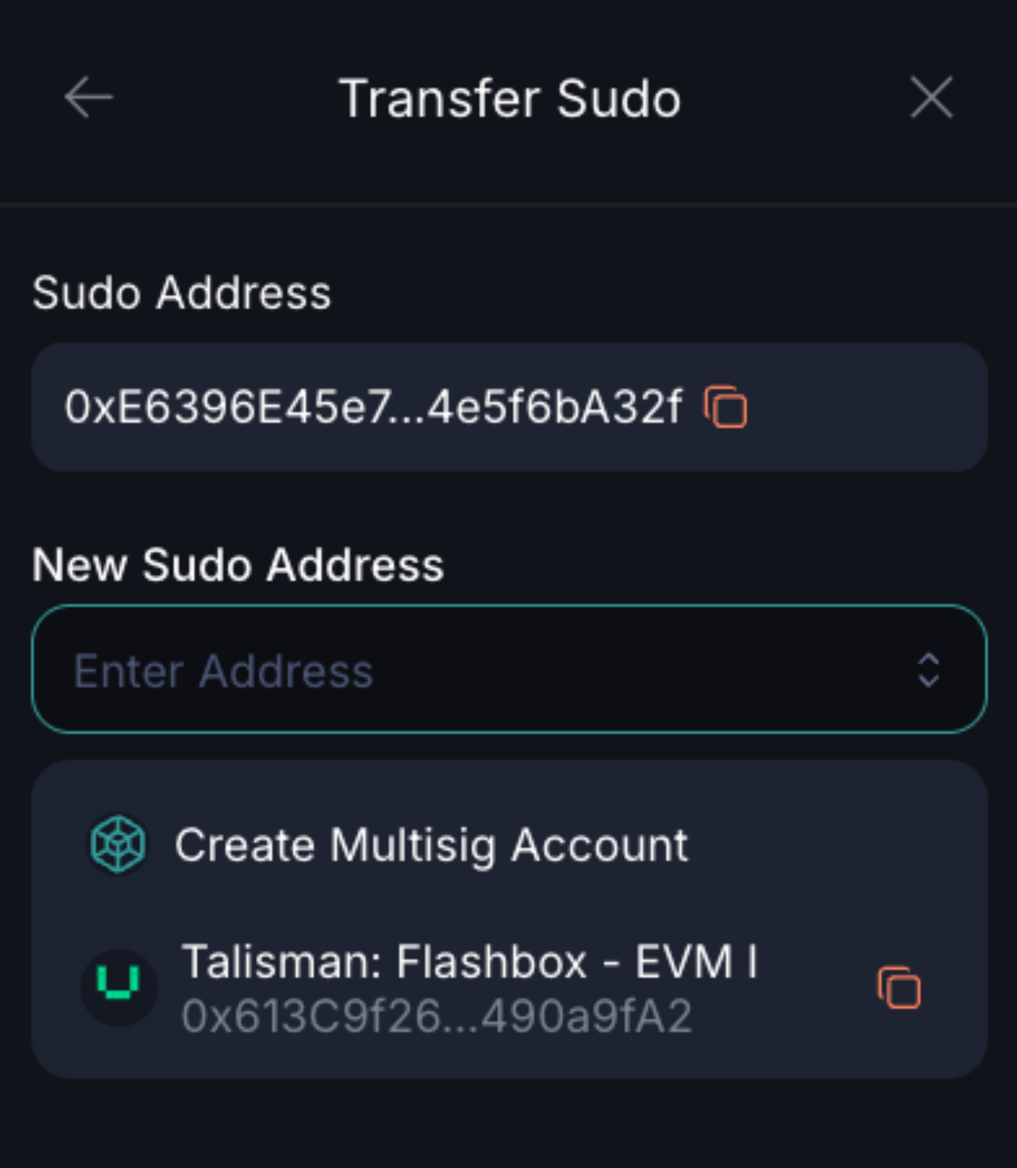 When you select the New Sudo Address field, a menu will be shown displaying the following entries: the multisigs you might have already created, the accounts you have connected to the dApp, and the Create Multisig Account action.